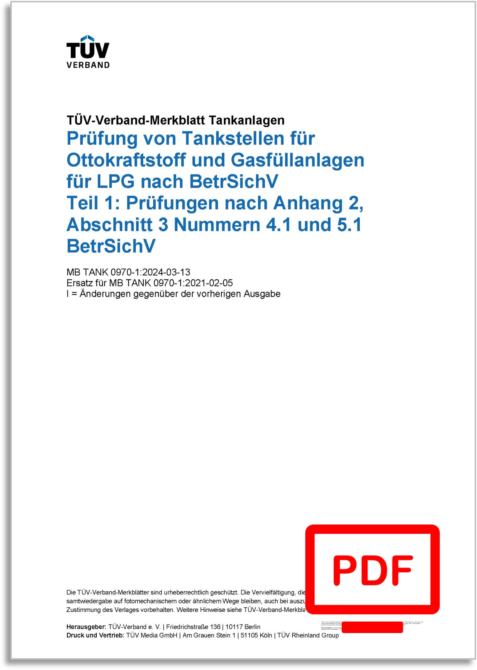 - MB TANK 970-1 - Prüfung von Tankstellen für Ottokraftstoff und Gasfüllanlagen für LPG nach BetrSichV; Teil 1: Prüfungen nach Anhang 2, Abschnitt 3 Nummern 4.1 und 5.1 BetrSichV (Ausgabe: 2024-03-13)