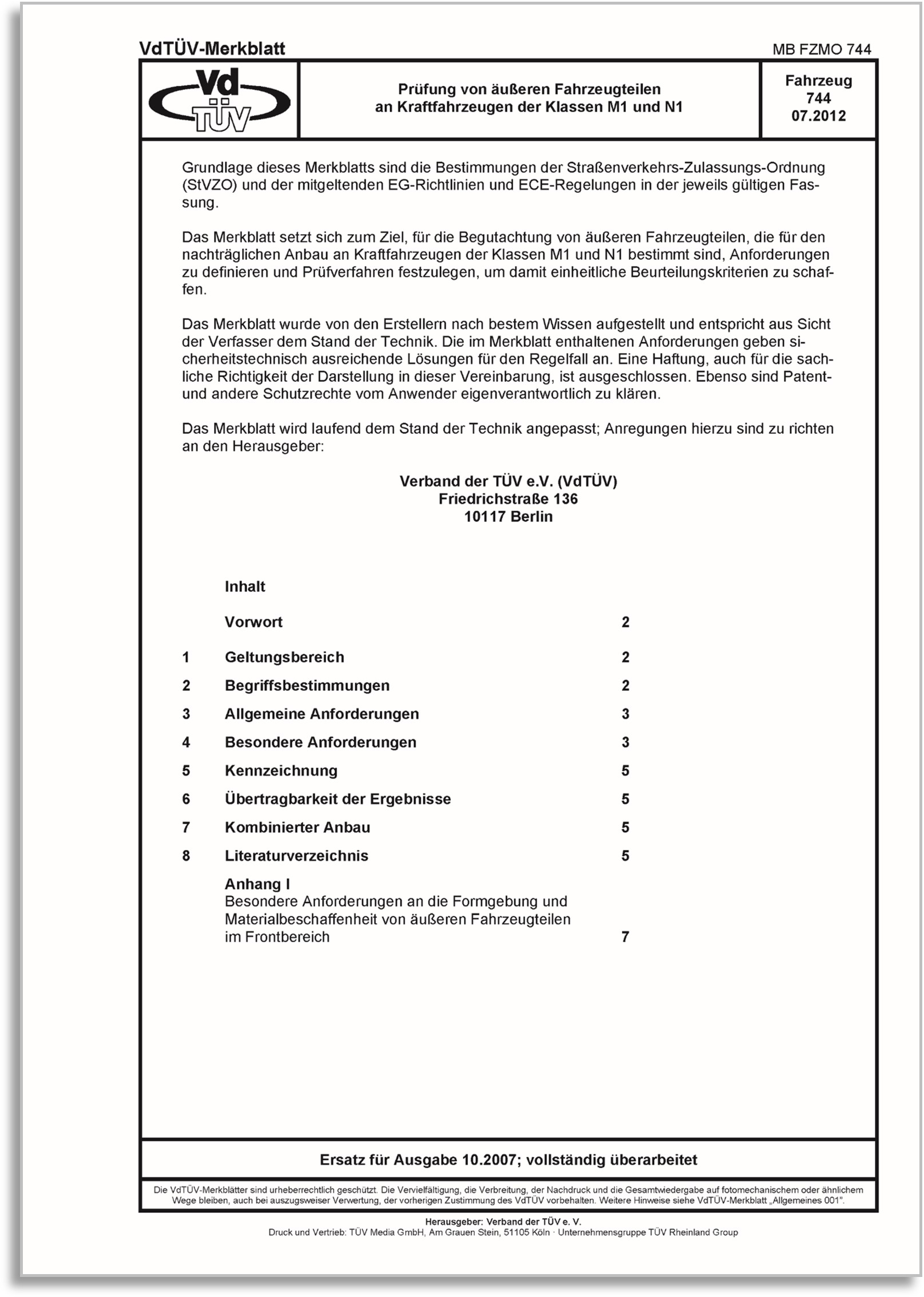 - MB FZMO 744 - Prüfung von äußeren Fahrzeugteilen an Kraftfahrzeugen der Klassen M1 und N1 (Ausgabe: 2012-07-01)