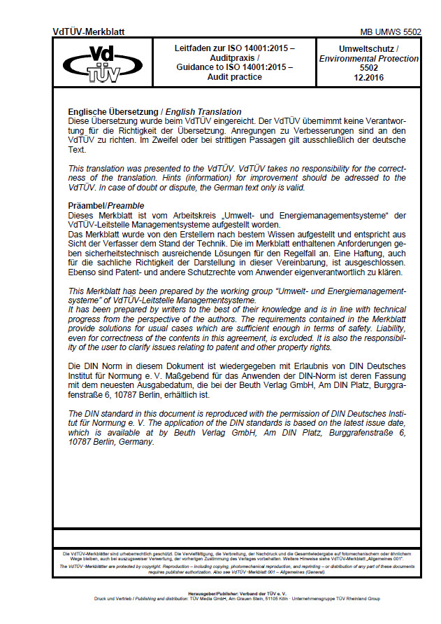 - MB UMWS 5502 - Leitfaden zur ISO 14001 :2015 - Auditpraxis / Guidance to ISO 14001 :2015 - Audit practice (Ausgabe: 2016-12-01)